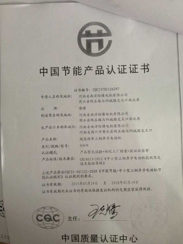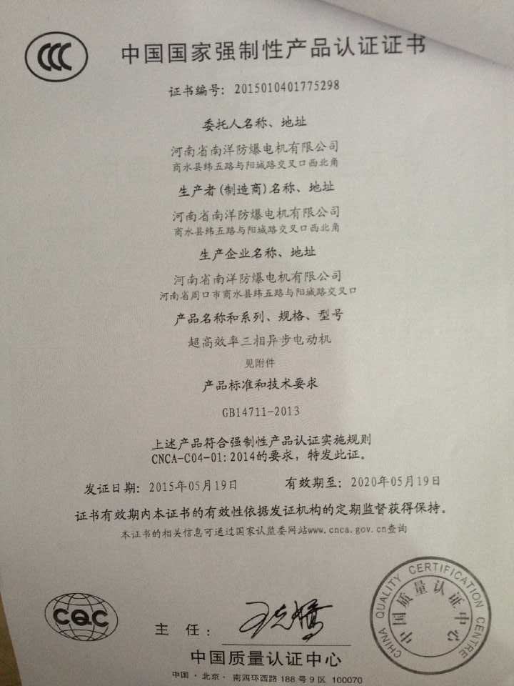 在2015年5月19日的这一天,对于河南省南洋防爆电机有限公司来说是值得庆祝的一天。因为就在这一天公司获得了YE3系列超高效率隔爆型电动机的双重产品认证证书。也就是说在这一天河南省南洋防爆电机有限公司可以投入YE3超高效率隔爆型电动机的生产了。至此普天同庆的时刻,河南省南洋防爆电机有限公司董事长王科伟先生代表公司对做出这一贡献的广大同仁表示慰问和感谢。