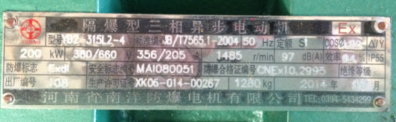 今天上午有个客户打来电话询问是否有YB2系列4P200KW防爆电机的现货,我说有的。然后我就把YB2系列4P200KW防爆电机的铭牌给客户发过去了。然后客户需要回去商量一下,下面为大家列出YB2系列4P200KW防爆电机的铭牌。如果大家有需要购买YB2系列防爆电机,可以和我们河南省南洋防爆电机生产厂家联系,我们会为您竭诚服务的。