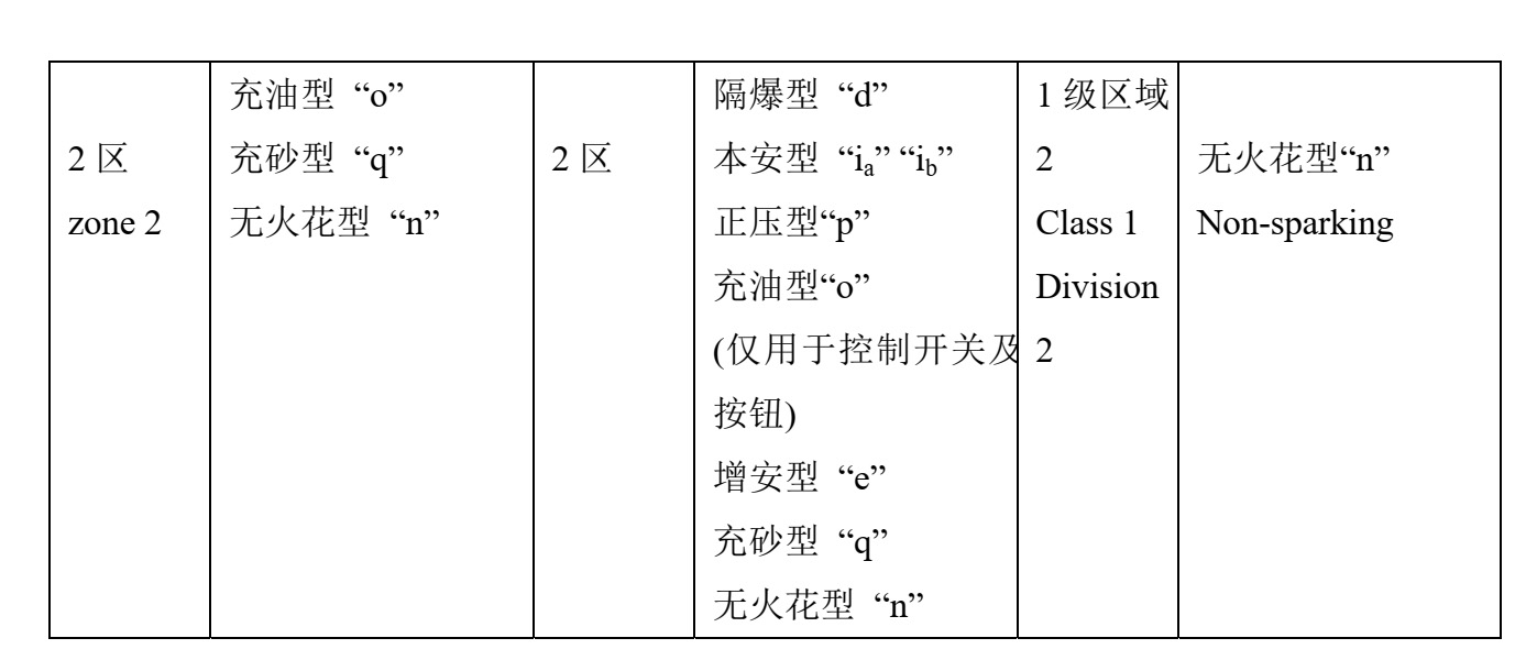 注:1于0区的防爆设备可用于1区和2区;用于1区的设备可用于2区;